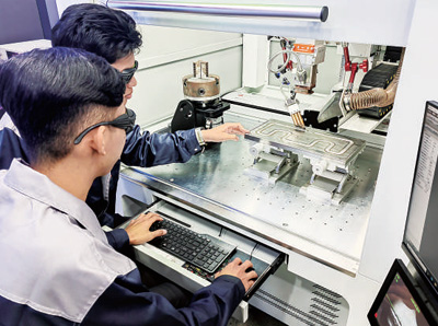由南京工业职业技术大学与柬埔寨柬华理事总会合作共建的柬华应用科技大学,是中柬职业教育交流合作的重要成果。图为该校学生正在进行现代焊接技术的实操学习。(查伊霍克/摄)