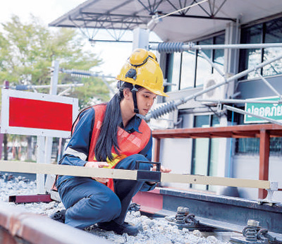 在泰国春武里技术学院内,轨道交通专业学生正在进行测距等实操学习。随着中泰铁路项目的推进,该学院积极与中国对口院校开展高铁技术培训等交流合作。(本报亚太中心分社 普拉维/摄)
