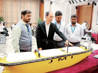 阿联酋郑和学院(阿布扎比)的中方教师,正在向当地学员介绍“海涵1号”无人船。(本报中东中心分社 塔里克·易卜拉欣/摄)
